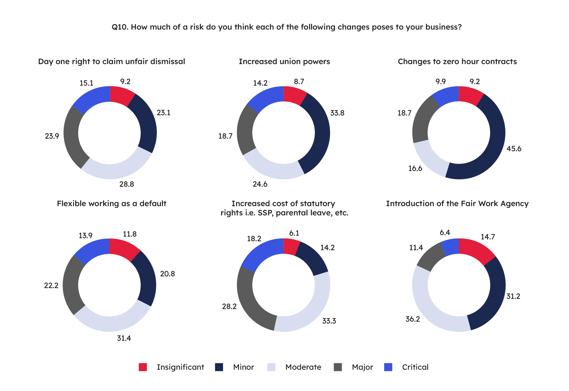 The day-one right to claim unfair dismissal stands out as the most supported policy change, with 72.1% of respondents backing it. Flexible working also sees strong approval (59.9%), reflecting a clear shift in workplace expectations. In contrast, fire and rehire is one of the least supported proposals, with only 28.5% in favour. Enhanced protections against sexual harassment, while vital, show lower support (15.7%), suggesting more awareness and education may be needed. Overall, the data highlights which policy changes businesses are ready to embrace—and which ones raise concern.